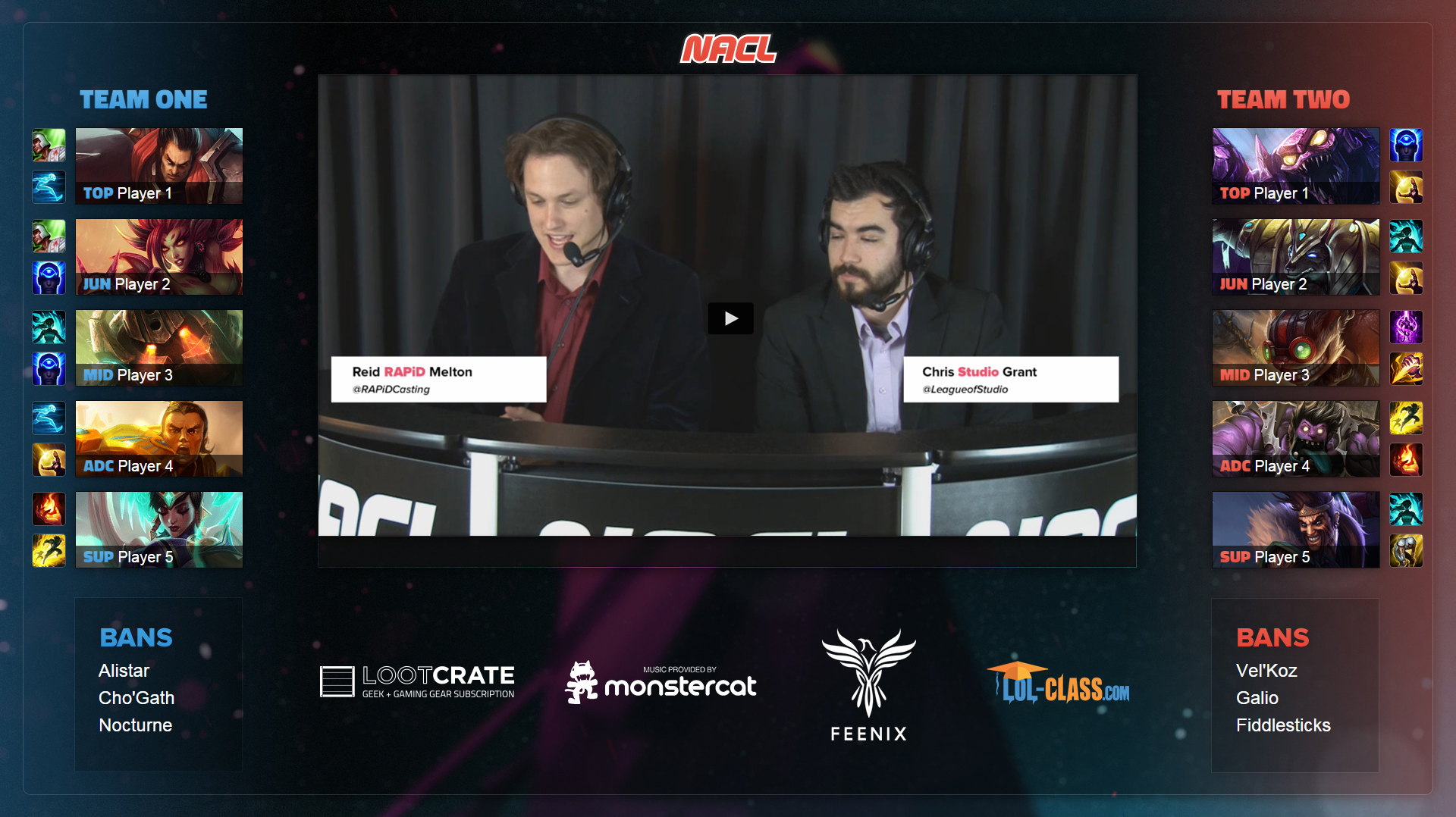 I was commissioned by the North American Challenger League to create an application to assist in the broadcasting of their tournaments on Twitch. The application featured a control panel to change each element in the application.